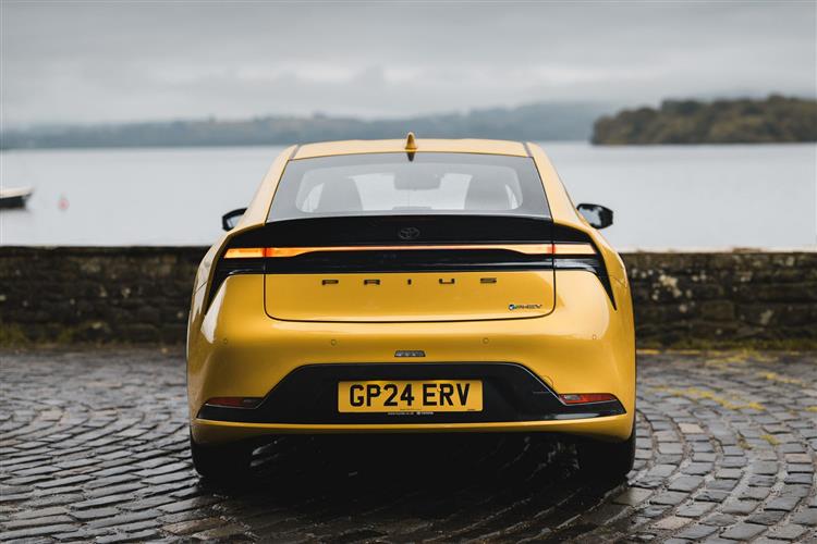 As you can see from the pictures, this MK5 model is a very different kind of Prius. Yes, the familiar wedge shape remains but it's far more sleekly fashioned in this form with the roof height lowered by 50mm. Overall length is cut back by 46mm and the rakish profile is set off by big 17 or 19-inch wheels. A light bar runs the whole width of the front, emphasising a width increase of 22mm. The rear view is accentuated by a three-dimensional linear lighting element focusing attention on the Prius logo. You might not be quite as taken with the cabin, though it does offer a big step forward in perceived quality. Toyota has decided to replicate the design approach of its bZ4X EV by providing a 'Peugeot i-Cockpit'-like format, which incorporates a high-mounted driver's combimeter screen, a little binnacle display pushed a long way back almost to the windscreen. You're supposed to view this monitor over the top of the wheel rather than conventionally through it, hence that stitched tiller's correspondingly small size. The bZ4X lineage does at least mean you get a decently-sized 12.3-inch 'Smart Connect+' centre touchscreen with built-in cloud-based navigation. And in contrast to the dated monitor of the previous model, it comes with smart graphics and over-the-air updates. Despite the shorter overall front-to-rear dimension, a 50mm increase in length between the axles means more space at the rear, though you'll still struggle to comfortably accommodate more than a couple of adults. Toyota has moved the roof peak rearwards to preserve headroom. Out back, there's a decently-sized 502-litre boot, much the same as that of the previous model.