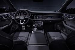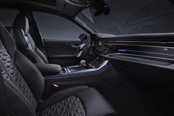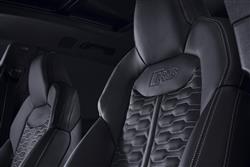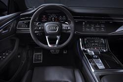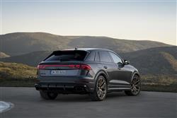 The key change with this update is that there are now two RS Q8 variants using the usual 4.0-litre twin turbo V8 petrol engine; the standard one with 600PS and 800Nm of torque; and the top performance version, with 640PS and 850Nm of pulling power, which offers the most powerful series-produced combustion engine in Audi Sport GmbH's history. It improves the standard model's 3.8s 0-62mph time to just 3.6s. By reducing back pressure, the newly developed, lighter RS sport exhaust system increases the output of the RS Q8 performance model, while creating a sportier, more evocative sound. And with performance-spec, the usual 155mph speed limiter is removed, allowing the car to surge on up to 174mph. With both models, you'll need only around 10 seconds more to get to 125mph. And drive is delivered via an 8-speed tipronic auto gearbox to a quattro 4WD system that can apportion up to 80% of torque to the rear (though 40:60-split front-to-rear is its usual setting) and to manage it all, there's an active torque vectoring limited slip differential. Lots more has also gone on to help handle all that power. You get a wider track than with an SQ8 (10mm more at the front and 5mm more at the rear) for a squater stance - and there are bigger brakes of course. And revised damper rates for the adaptive air suspension. As standard-fit, there are two further features: a 48V anti-roll system and a four-wheel steer set-up that reduces cornering understeer and promotes the kind of turning ability you'd think would be impossible for a car of this size. When changing lanes quickly, the rear wheels turn up to 1.5 degrees in the opposite direction of the front wheels. At lower speeds, they turn up to five degrees in the opposite direction of the front wheels. This reduces the turning radius accordingly. There's the usual drive mode system and your favourite blend of attributes can be stored and summoned by pushing the provided RS button on the steering wheel which has two settings; RS1 (where perhaps you'd store your more laid-back settings) and RS2 (for when you want to select a more aggressive demeanour).