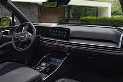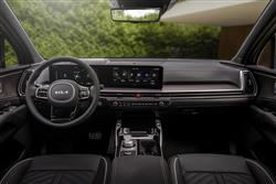 On the move, this PHEV plug-in model's 90hp electric motor does a reasonable job of powering the car in battery motion mode and when the 13.8kWh battery pack runs out (after about 35 miles) and the 1.6-litre T-GDi turbo engine cuts in, the combined power output - 261bhp - is more than enough for most safe overtakes, or pressing on when you're late for the school pick-up. 62mph occupies 8.4s en route to 119mph; you certainly wouldn't want to go any faster than that in a car like this. You might wish for a bit more pulling power through the six speeds of the drivetrain's auto gearbox though; there's only 350Nm of it, which isn't a great deal to propel along a 2.1-tonne 7-seat family SUV. That's why towing capacity is limited to 1,500kgs. This car still retains a reasonably degree of 'off piste' capability though. Its standard 4WD system incorporates three bespoke 'Terrain' drive modes which you select from this centre console dial - 'Snow', 'Mud' and 'Sand'. But there's not really enough ride height to venture anywhere too gnarly with this Kia, so the 'Terrain' side of the drive mode dial will probably remain largely unused. More everyday useful settings come when a push of the same dial clicks you in to three separate tarmac 'Drive' modes that alter steering feel, throttle response and gear change timings. Most of the time, you'll leave the car in the 'Smart' setting, basically an auto mode that sorts everything out for you. There's also an 'Eco' mode. And a 'Sport' setting for when you want to push on, though you won't want to do that terribly often in this kind of high-sided SUV.