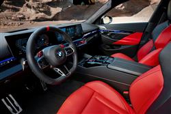 This car's S63 series 4.4-litre V8 is the most potent engine ever devised by BMW's high performance M division. Which is just as well because it has to carry around a lot of weight. Still, 270kg of that extra bulk is there to facilitate the electrified addition to this M5's drivetrain that's increased total output so much. From 625hp in the old F90 M5 Competition to 727hp here. 585hp of that is from the engine and 197hp from an electric motor energised by an 18.6kWh battery large enough to make this a performance PHEV, with an all-electric range of up to 42 miles. Ignore the EV drive modes and this M division-curated confection shrugs off its prodigious 2.5-tonne kerb weight with bombastic speed, 1,000Nm of torque this super station wagon to 62mph in 3.6s en route to 189mph (if the optional 'M Driver's Pack' is fitted). Power is channelled via a toughened-up version of the 8-speed automatic transmission you'd find on a regular combustion 5 Series Touring and there's a 'Boost' mode you can activate to prompt faster acceleration by pulling on the wheel's left hand gearshift paddle. So it's fast enough in a straight line. Where you might worry, given all that powertrain bulk, is in this beefy G99 series M5 Touring's ability to tackle the turns. The Garching engineers fretted about this too and spent six years on handling development of this seventh generation M5 design as a result. For sharper corner turn-in, they added rear-wheel steering ('Integral Active Steering' in BMW-speak), which can turn the back wheels by up to 1.5-degrees. Plus there's a wider track, re-tuned steering, bespoke kinematics and elastokinematics on both axles and an adaptive suspension set-up able to adjust the new Bilstein dampers independently at each wheel. BMW's resisted the temptation though, to add the active anti-roll bars that are fitted to the M60 Touring EV; apparently, the M5's passive ones give more linear, natural levels of body roll. Thanks to the Hybrid system, there's a wide choice of drive modes - 'Hybrid' and 'M Hybrid' (which mix the power sources), 'Electric' (full-EV), 'Dynamic' (for track and fast road driving) and 'Dynamic Plus' (for all-out system power). All that's before you start accessing the centre screen to adjust chassis, steering, brakes, all-wheel drive and transmission, saving your preferred to settings to the red M paddles provided for the purpose behind the steering wheel. On the move, expect to notice this G99 series model's weight; but on tighter roads, you'll notice it's prodigious width even more.