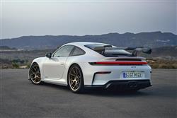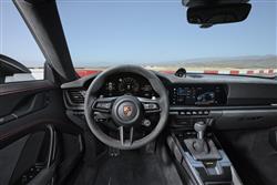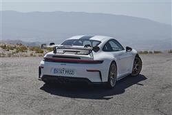 The GT3-unique 4.0-litre normally aspirated flat six engine in play here has the same 510PS (450Nm) output as before, but gains revised cylinder heads, sharper camshafts (from the GT3 RS), improved oil coolers and new throttle valves with better flow. As previously, this GT3 can still be ordered with either a manual gearbox or a seven-speed dual clutch auto (though both transmissions have had their final drive shortened by 8%). The 0-62mph times remain at 3.9s and 3.4s respectively. The engine spins to 9,000 revs, you can hold 2nd gear at up to 80mph and it's all accompanied by wonderful combination of intake roar and valvetrain scream. There's nothing else quite like it. Most of the time you'll be in 3rd, which is a wonderfully wide-spaced ratio. For this updated model, Porsche says that it's re-tuned the dampers to enhance control over bumps and circuit kerbs. And the anti-dive system has been worked on to reduce forward pitch when braking. When this 992-era model was first launched, the big news with it was the inclusion of front double wishbone suspension (together with revised multi-link rear suspension), together programmed to make the four-wheel steering system work as Porsche wanted it to. That's helped circuit prowess but not roadgoing ride quality; the standard GT3 is still easily thrown about by bumps and cambers, sometimes somewhat disconcertingly. Which is why our preference would be for the GT3 'Touring Package' model, which is still stiff but a much better road car, particularly when specified with either of the more road-focused tyre packages that Porsche offers. As you'll know if you're a long-time GT3 enthusiast, drive is from the rear only, this variant spurning the heavy 4WD system from the 911 Turbo. So for traction through the corners, you rely instead entirely on a locking differential that works alongside the car's brake-based torque vectoring system. And talking of brakes, track-ready ceramic discs with urgent stopping power are standard - as they should be. Refinement has of course been sacrificed in the name of weight-saving for this track-focused variant, but there's a little less of a cruising din than on earlier generation GT3s we've tried. You really have to pay the extra for the optional front axle-lift system, otherwise speed humps and ramps are going to be a constant challenge.
