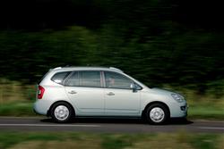 The key decision with compact MPV models like the Carens, and the one that has taxed the minds of many major manufacturers, is whether to go with five or seven seats. Volkswagen and Ford were midway through the design process of five-seat MPVs when Vauxhall launched the seven-seat Zafira, completely changing the rules. Original designs were scrapped, only to be revisited when it was realised that a niche for five seat models still existed. Kia neatly sidestepped this quandary by offering the Carens in both five and seven seat forms. The ultimate testament to how well the Carens is packaged comes when you try to lever an adult into the back row of a seven-seat model. With most mini-MPVs, their knees will be up around their ears and there's a very good reason for this. Not only is overall legroom limited by the sheer amount of cabin space required to fit three rows of seats, but the petrol tank is usually situated under the last row, forcing the cabin floor upwards. Next time you get in a seven-seat mini-MPV, get a tape measure and check the height between the top of the seat cushion and the floor. It's often around four or five inches which is frankly laughable if you're expecting adults to get in the third row. Kia got around this problem by designing a shallow petrol tank that sits inside the rear suspension subframe. This drops the floor height by some 40mm, allowing for a more relaxed seating position. The Korean company reckoned that adults of 5'11" will be comfortable in the rearmost row of seats in the seven seat model, although that may be pushing it a little. This Carens is substantially larger than its already sizeable predecessor. Despite competing price-wise against compact MPVs, the Carens is definitely at the large end of the mini-MPV sector in terms of size. From front bumper to rear, it's less than 10cm shorter than something in the class above, such as a Volkswagen Sharan. Longer, wider and taller than its predecessor (by 55, 50 and 40 mm respectively), this Carens does not share a single panel with its predecessor and its smoother exterior results in significantly improved aerodynamics. The 4,545mm long Carens has an aerodynamic coefficient of drag of an impressive 0.32 - down from 0.35 for the previous model - which helps with fuel economy and high speed refinement. The sleek look to the Carens helps in the styling department too. The windscreen is raked further back, the front styling features a twin chromed bar grille, a lower centre air intake and a front bumper with inset air intakes or, when specified, fog lamps. There are some Sports Utility Vehicle design cues there too, with a more aggressive look and black roof rails. You'd be surprised to hear that this is one of the cheapest mini-MPVs you could lay your hands on if you didn't know what it was.