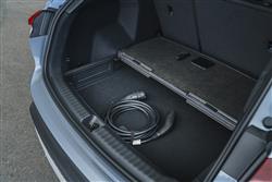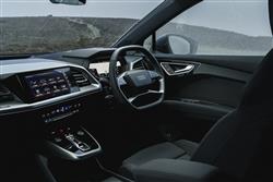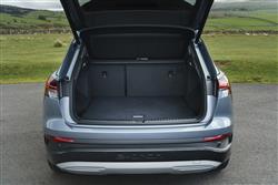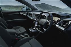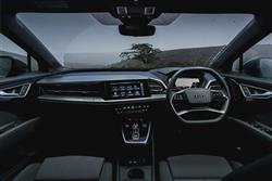 The Q4 e-tron offered what Audi called 'the next step' in its design language for electric models, an approach heralded by the Q4 concept car the brand unveiled back at the Geneva Motorshow in 2019. By 2021, a lot had changed in the world, but the look of the Q4 didn't, the shape characterised by short overhangs, large wheels and a surface treatment that was clear and pared-back, but also intersected by super-precise high-definition lines. You might struggle to call it pretty, but it's certainly striking, especially in the alternative Sportback e-tron form that offers a sportier-looking body style option for prospective Q4 folk. Inside up-front, it's certainly nothing like anything you'll have seen from any previous Audi. Everything on the upper level is angular, with none of the elements appearing to blend very harmoniously with each other, but it all kind of works in a contemporary, minimalistic sort of way. There's an unusual jutting lower console trimmed in smudge-worthy piano black for the neat little gear selector slider. And, just above, the silver trimmed central fascia section incorporates horizontal vents and the 11.6-inch MMI Navigation Plus central display, with a sweep across the cabin that gets interrupted by a beady-browed instrument binnacle. If you've a Q4 with brake recuperation paddles, that binnacle's 10.25-inch 'Virtual cockpit' screen has to be viewed through a rather weird quartic steering wheel with flattened top and bottom sections. Futuristic? You'd say so. Premium? Possibly, but only really if you spend some cash on a more up-market level of trim. The need to house the big battery under the rear bench brings with it the benefit of positioning back seat folk 70mm higher than those in the front, giving them an excellent view forward, though a little at the expense of headroom. Mind you, that's something taller occupants will only really more acutely notice if the panoramic glass roof has been fitted. It's also wider cabin than you'd expect a relatively compact mid-sized SUV to be able to provide and with no central transmission tunnel to obstruct things, three adults could actually fit reasonably easily into the back of this car. Let's finish with the boot. Unlike in volume versions of the ID.4, power assistance for the tailgate is standard across the range and it rises to reveal a 520-litre space in the SUV model - curiously, it's actually more in the Sportback version, 535-litres.