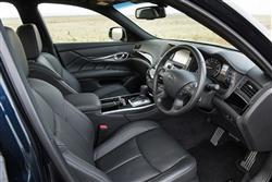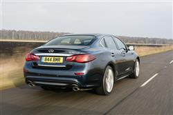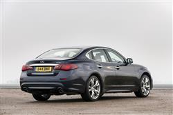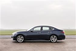 Long bonnet, short front overhang, raked back windscreen, short tail. With this Infiniti M / Q70 model, all the usual Infiniti design cues are in place, melting into a shape slightly longer than that of obvious German rivals and said to be inspired by natural wave-like forms. Depending on who you believe, this is simply a development of the Japanese market-only Nissan Fuga of 2004 or a more practical interpretation of the brand's Essence supercoupe concept paraded at Motorshows five years later. Whatever the truth, it's certainly a shape with an up-market if rather Oriental feel, quite sufficient to achieve the golf club cred many owners will be seeking. Premium but unpretentious would be one way of describing it, a phrase also appropriate for the leather-lined interior. A broad centre console bisects the dash and continues on between the seats, creating very distinct zones for both driver and passenger. Both are enveloped by soft leather and gloss wood that Infiniti claimed was similar in finish to that used for centuries across Europe for the manufacture of luxury furniture or high class musical instruments. We can't remember too many Queen Anne chairs or Louis XVI pianos featuring a 'white ash with silver powder' finish - but then we could be wrong. Anyway, it isn't enough to dispel what at the end of the day is a very Asian feel. For us, that's a good thing. Infiniti here went beyond simply trying to copy the Teutonic brands and tried, and in many ways succeeded, in creating a cabin with a more welcoming, less clinical feel. The analogue clock is lovely and everything you touch, every panel, every surface is soft and sensuous. Plush Premium models even have a 'Forest Air' setting in the climate control to waft leafy or wood-scented aromas over you while you drive. Despite a central control system with a high-mounted centre screen to display sat nav, air conditioning and in-car entertainment settings, there are still rather too many switches and buttons but once you master them, it's all pretty intuitive. Better still, few will struggle to find an ideal driving position, though prolonged fiddling with the ten-way adjustable electric seat may be necessary to do so. And in the rear? Well one of the disappointments of graduating from a BMW 3 Series-sized compact executive saloon to a fully-fledged BMW 5 Series-sized Executive sector conveyance is that the extra size and money still doesn't buy you a back seat capable of taking three adults any real distance. So it is here. Unless you're an uncomplaining child, you won't want to be perching on the centre seat for any real length of time. But those either side of you would be very comfortable indeed, enjoying significantly more knee room than they'd get in a 5 Series. A perfect place to enjoy the cosseting ride, engineered specifically so that occupants could write legibly over poor surfaces at speed. Perhaps that's one of the reasons why the boot is a little smaller than obvious rivals, an issue that would to some extent be mitigated if you could fold down the rear seatbacks to extend it. But you can't. Still, lift the 'ducktail'-designed boot lid and you'll find 450-litres available to you in the 2.2 and 3.0-litre diesel volume variants - which will probably be quite sufficient for most buyers. It's a figure that for some reason increases to 500-litres in the 3.7-litre petrol V6 but predictably falls to just 350-litres in the 3.5-litre hybrid version due to the need to accommodate all those batteries. A ski-hatch promises an extra option for longer items.