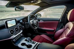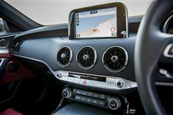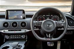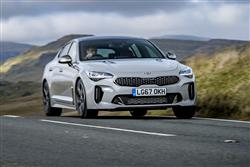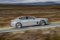 German brands need to understand that you don't create a 'Gran Turismo' simply by switching to a five-door body shape from an existing saloon and adding a rear spoiler. Designer Gregory Guillaume seems to have appreciated that better than his counterparts at Audi and BMW and, as a result, the Stinger's longer, lower and quite differently proportioned from anything else in the segment. Mounted between complex dark chrome headlamp units that feature LED beams on the top V6 model, there's a different interpretation of Kia's 'Tiger Nose' grille, with jewel-studded metallic effect finishing. Primary cooling though, is dealt with by the large lower grille and air intake, which is flanked by scoops that channel cooling air to the brakes. Step round to the rear of the Stinger and you're also left in no doubt about the car's sporting intent, particularly on the top 3.3-litre V6 GT S version, which has twin exhausts poking potently out of each side of the aggressively-shaped rear diffuser. Inside, you sit low on leather stitched figure-hugging sports seats, view a broad faux leather soft-touch-trimmed centre console and grasp a flat-bottomed three-spoke D-shaped wheel over which you can also view a head-up display. The 8-inch centre-dash touchscreen is one of the elements borrowed from cheaper Kia models, but it's been well integrated. There are definite hints of Porsche and Mercedes here - the stubby auto gear lever, the 'jet turbine'-style three chromed central round vents - but the cabin's much more than some kind of derivative Teutonic 'homage'. It has its own sense of style and quality too, with cool metal surfaces, stitched leather trim panels and beautifully damped switchgear. What's on offer in the rear can't match the palatial standards of a rival Volkswagen Arteon, but it certainly out-classes competitors from Audi and BMW and if you take a seat in a rival Jaguar XE after trying one of these, you'll feel like you're in a supermini. Out back, if you avoid entry-level trim, you get a powered tailgate and once it raises, a shallow but quite spacious-looking 406-litre cargo area is revealed.